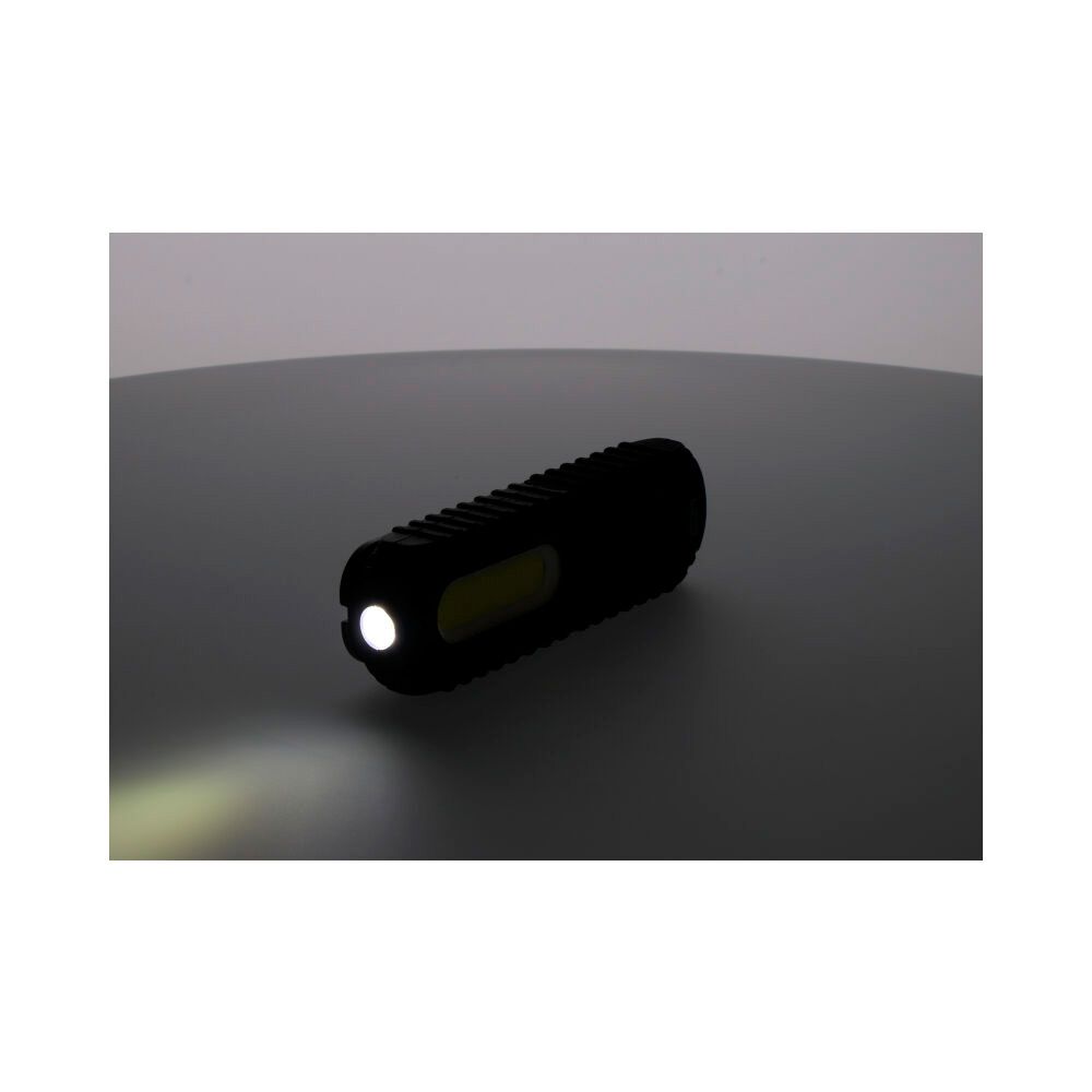 LINTERNA DE TRABAJO LED COB 3 W 90 lm 7.000 K / 5 W 300-150 lm 6.500 K. RECARGABLE CON USB TIPO C INCLUIDO. BATERÍA DE LITIO INCLUIDA DE 2000 mAh, SOPORTE BASCULANTE 180° IMANTADO CON GANCHO Y CLIP. INDICADOR DE BATERÍA, IP33 - HASTA 7 h DE AUTONOMÍA, CARGA EN 3 h. LINTERNA ANTICHOQUE. MEDIDA: 5,3 x 2,5 x 16 cm. PRESENTACIÓN EN EXPOSITOR DE 6 uds