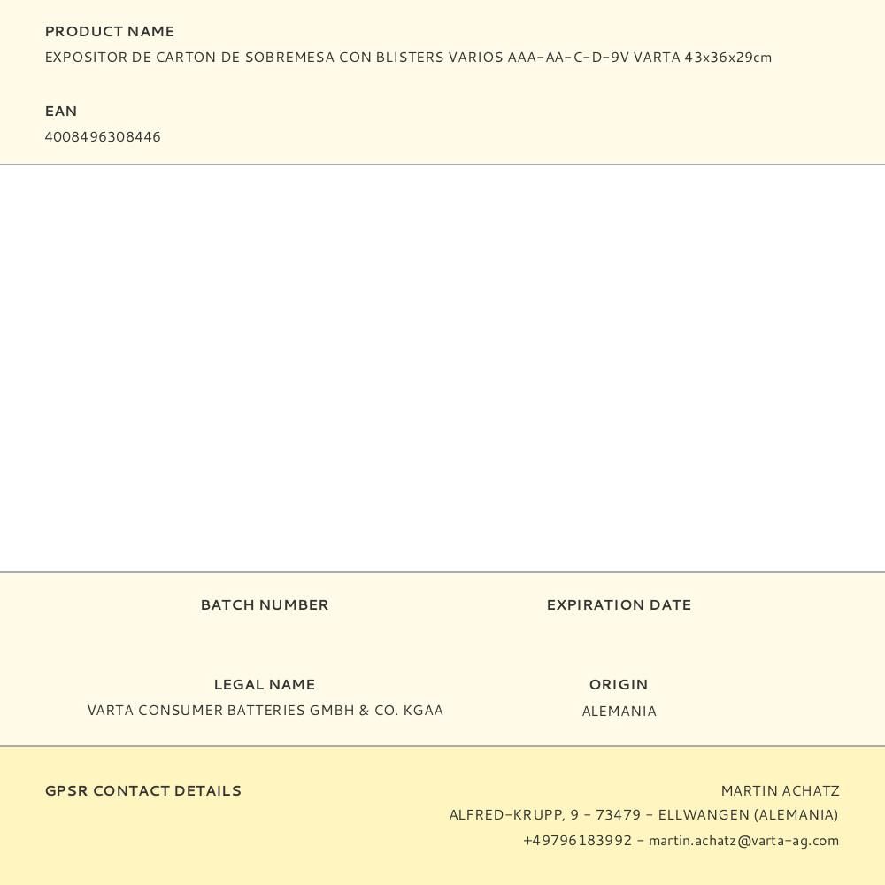 EXPOSITOR DE CARTON DE SOBREMESA VARTA CON BLISTERS VARIOS. INCLUYE: AAA x 26 unid. - AA x 30 unid. - C x 5 unid. - D x 4 unid. - 9V x 8 unid.. TAMAÑO 43x36x29cm (ancho/fondo/alto)