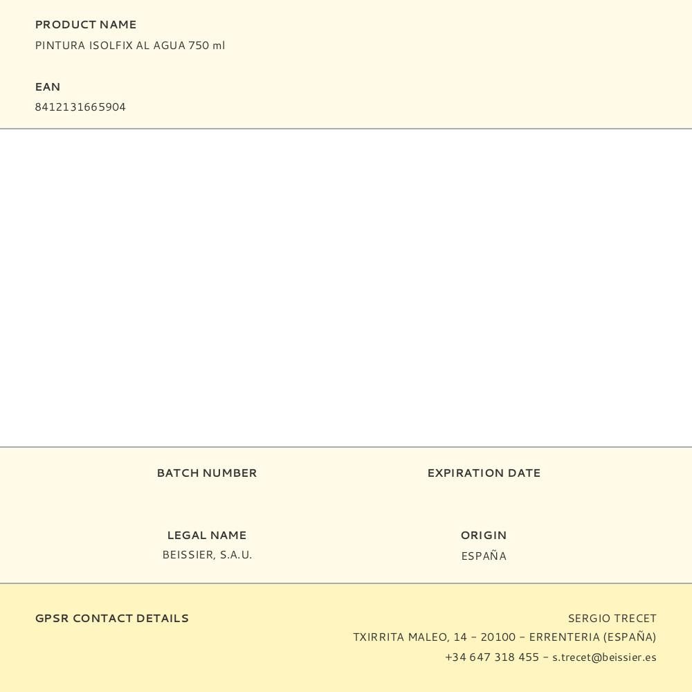 PINTURA AL AGUA ISOLFIX ANTI MANCHAS BLANCO 750 ml PINTURA CUBREMANCHAS AL AGUA PARA AISLAR Y CUBRIR MANCHAS DE HUMO, NICOTINA, HOLLIN, CAFE, TANINOS, ACEITE, GRASAS, MANCHAS DE AGUAS SECAS, ROTULADORES, ETC. EXCELENTE CUBRICIÓN DE MANCHAS DE LIGNINA EN PLACAS DE CARTON-YESO. IDEAL PARA CUBRIR MANCHAS EN COCINAS Y BAÑOS. SIN OLOR. LIBRE DE DISOLVENTES Y AMONIACO. LAVABLE. RESISTENCIA AL FROTE EN HUMEDO: CLASE 1 SEGUN UNE-EN 13300. RESISTENTE A LA HUMEDAD AMBIENTE. REPINTABLE EN 20 MINUTOS. NO GOTEA NI AMARILLEA. COLOR BLANCO