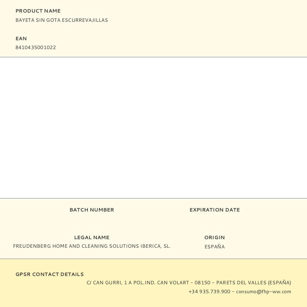 BAYETA SIN GOTA ESCURREVAJILLAS. ESPECIAL ESCURRE VAJILLAS ABSORBENTE Y QUE NO SE ACARTONA. TRATAMIENTO ANTIBACTERIAS PARA COMBATIR LOS MALOS OLORES. TRATAMIENTO BACTI-STOP QUE COMBATE EL DESARROLLO DE GERMENES Y BACTERIAS, AYUDANDO A FRENAR SU PROPAGACION INCLUSO CUANDO PERMANECE HUMEDA DESPUES DE SU USO