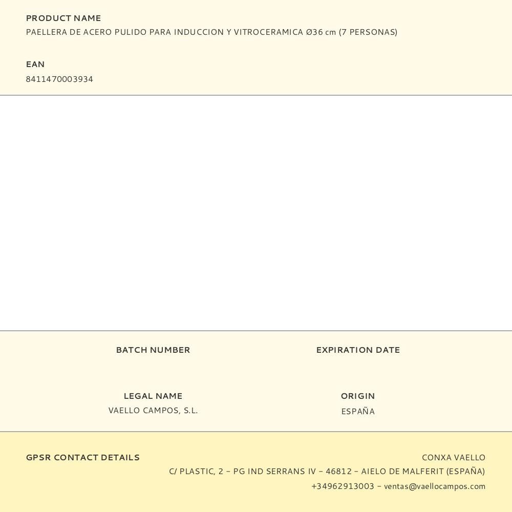 PAELLERA DE ACERO PULIDO Ø36cm (7 PERSONAS) APTA PARA COCINAS DE INDUCCION Y VITROCERAMICA. FABRICACION NACIONAL. ATENCIÓN: REQUIERE MANTENIMIENTO. DEBE SER ALMACENADO CON UNA CUBIERTA DE ACEITE. VAELLO