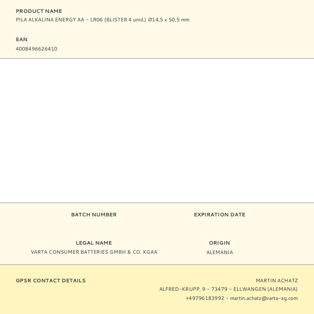 PILA VARTA AA - LR06 "ENERGY VALUE PACK" (BLISTER 4 unid.) Ø14,5x50,5mm (diámetro/alto)