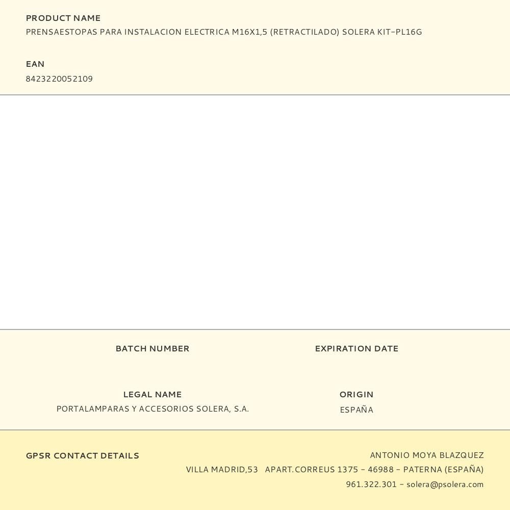 PRENSAESTOPAS PARA INSTALACION ELECTRICA M16X1,5 (RETRACTILADO) SOLERA KIT-PL16G