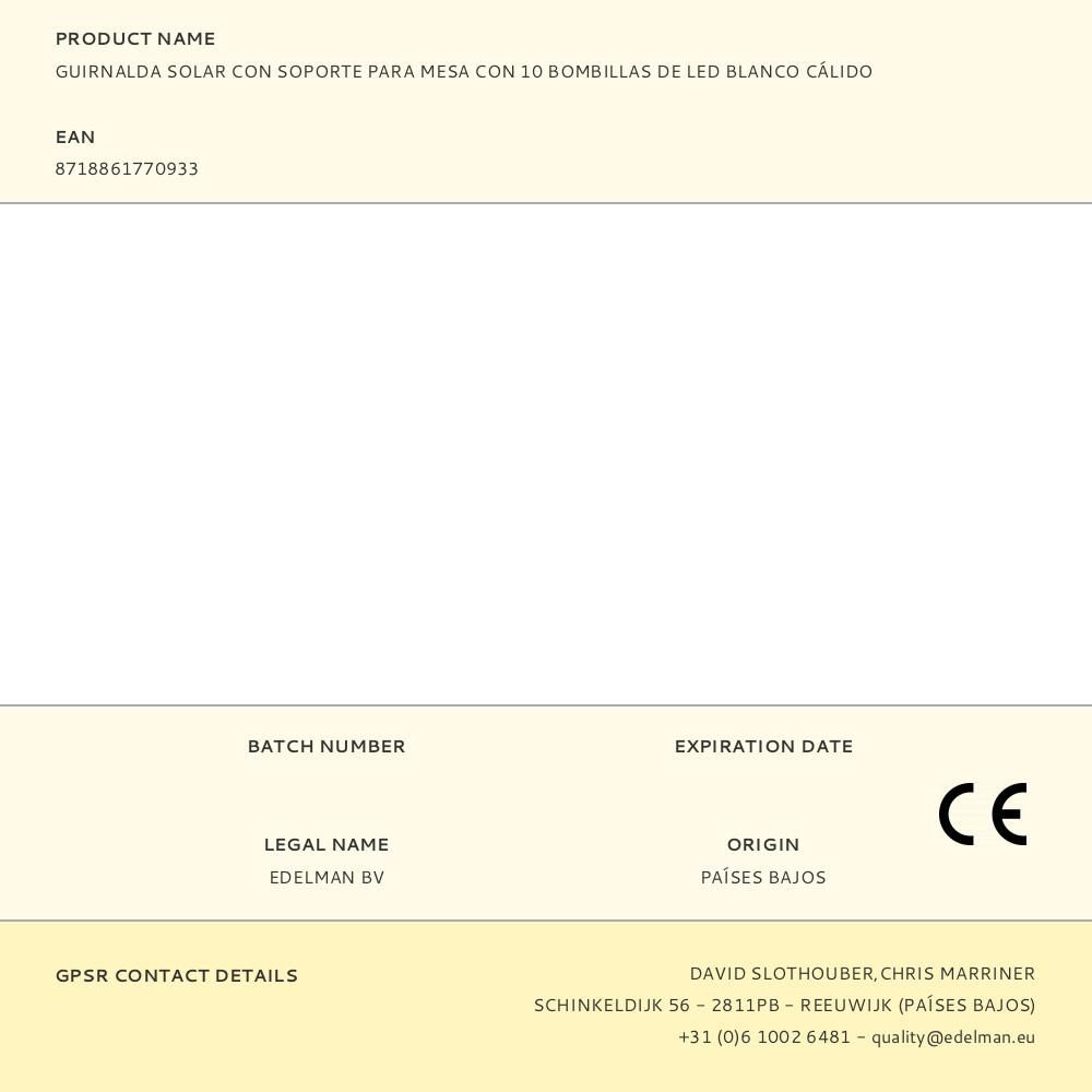 GUIRNALDA SOLAR CON SOPORTE PARA MESA CON 10 BOMBILLAS DE LED BLANCO CÁLIDO. DURACION 6-8h. APTA PARA EXTERIOR, EXTENSIBLE ANCHO 132 - 250 cm ALTURA: 110cm