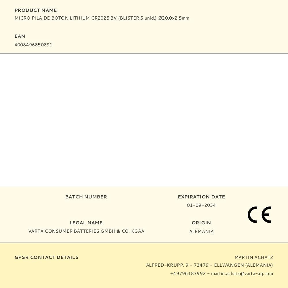 MICRO PILA DE BOTÓN LITIO CR2025 3 V Ø20,0 x 2,5 mm BLISTER 5 uds