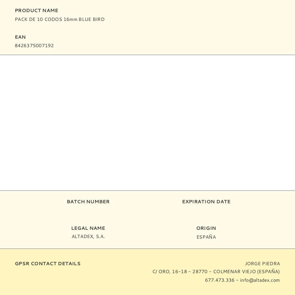 CODOS Ø16 mm. PERMITE CONECTAR DOS TRAMOS DE TUBERIA DE 16 mm. CON UN ÁNGULO DE 90°. RECOMENDADO PARA DISTRIBUIR LA TUBERIA CORRECTAMENTE EN LAS ESQUINAS DEL TERRENO. MATERIAL: POLIPROPILENO. TRATAMIENTO ANTI UV. CONTIENE: 10 uds