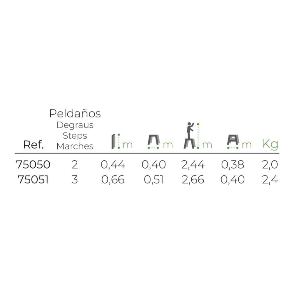 TABURETE ALUMINIO 3 PELDAÑOS SEGUN UNE EN 14183. MEDIDAS PLEGADA 39,5x14x82cm. ALTURA DEL ÚLTIMO PELDAÑO 0,66cm. PESO DEL TABURETE: 2,4kg PESO MAXIMO: 150kg