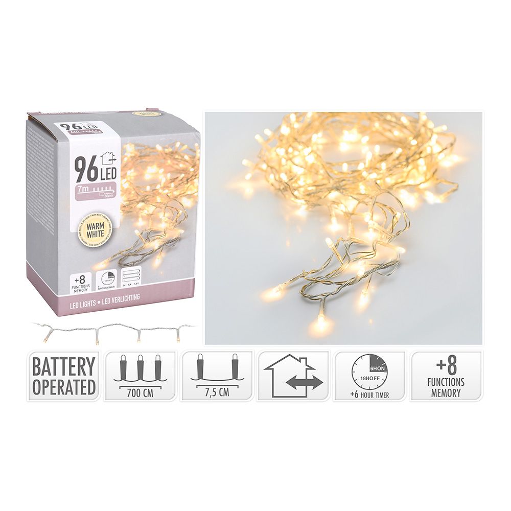 GUIRNALDA A PILAS MULTIFUNCION 96 LEDS CABLE TRANSPARENTE LUZ BLANCO CALIDO PILAS 3xAA NO INCLUIDAS IP44 7,5cm ENTRE BOMBILLAS LEDS 5mm PROGRAMADOR 8 FUNCIONES CON MEMORIA + TEMPORIZADOR 6h ENCENDIDO 18h APAGADO CABLE ALIMENTACIÓN 50Cm. DISTANCIA ENTRE LA PRIMERA BOMBILLA Y LA ULTIMA 7m. LARGO TOTAL: 7,50m.