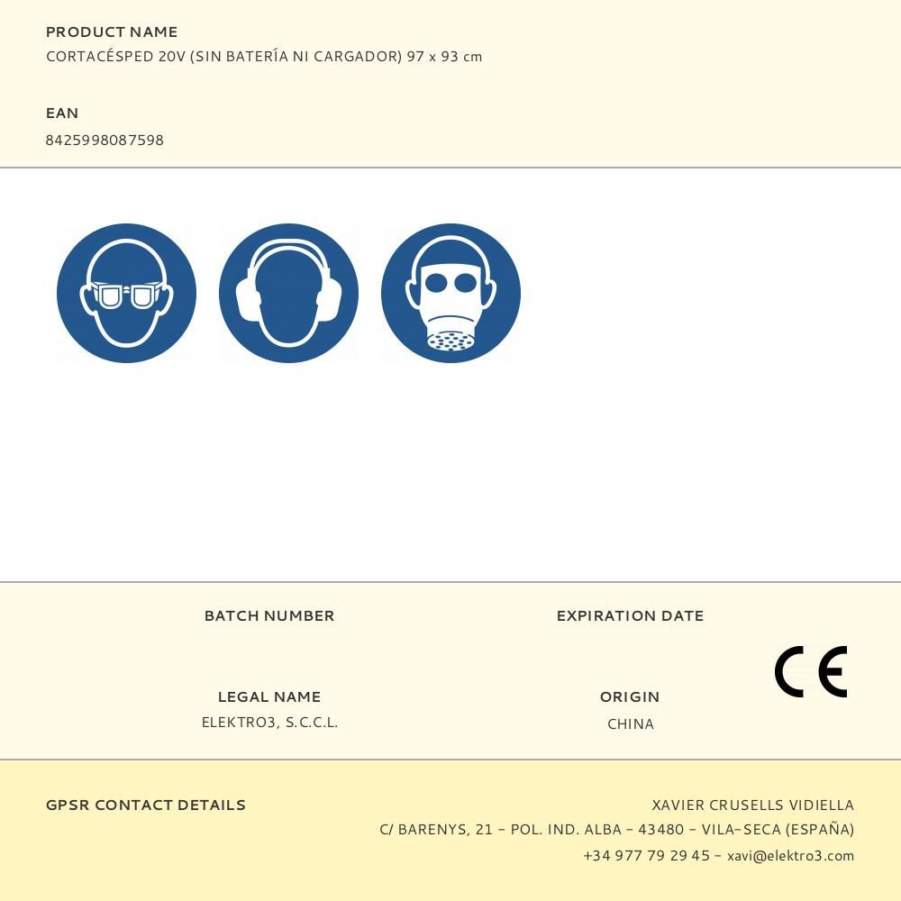 CORTACÉSPED. POTENCIA: 20V (SIN BATERÍA NI CARGADOR). VELOCIDAD SIN CARGA 2900rpm. MÁXIMO ANCHO DE CORTE 330mm. ALTURA DE CORTE REGULABLE 25-75mm. HASTA 5 NIVELES. RECOGEDOR DE HIERBA 30L. UTILIZAR SOLO BATERIA REF 08771. DECIBELIOS: 96dB. 20V-CC. DIMENSIONES: 97 x 93 cm