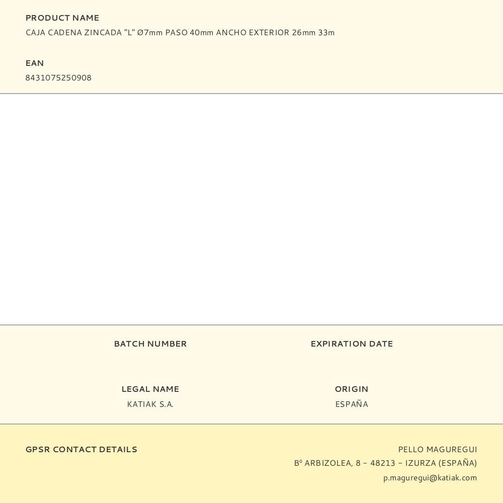 CAJA CADENA ZINCADA "L" Ø7mm PASO 40mm ANCHO EXTERIOR 26mm 33m