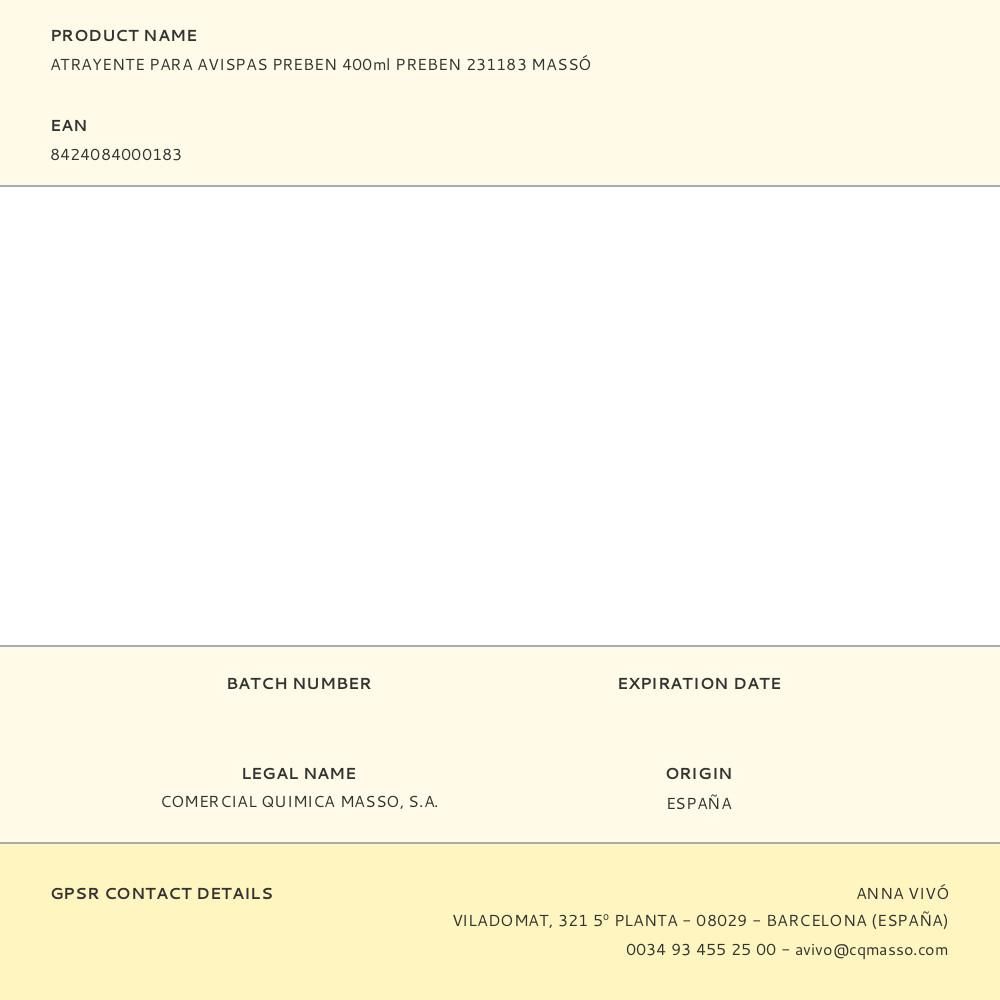 ATRAYENTE PARA AVISPAS, 400 ml. CEBO CONCENTRADO A BASE DE EXTRACTOS NATURALES DE AROMAS ALIMENTICIOS. ATRAE AVISPAS, AVISPONES, MOSCAS Y OTROS INSECTOS EN SU PISCINA, TERRAZA, JARDÍN, ETC. CON CADA UNIDAD SE PUEDE GERERAR 4 TRAMPAS APROX. 30-40 DÍAS POR ENVASE
