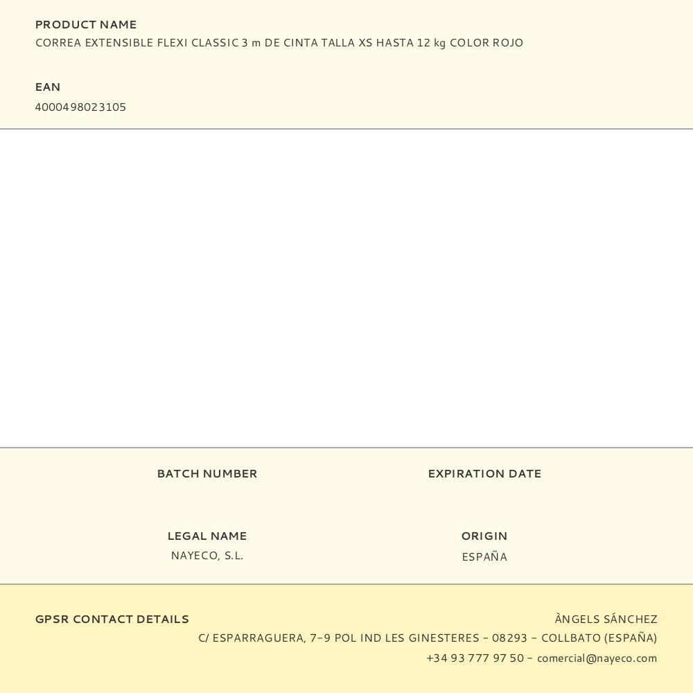 CORREA EXTENSIBLE FLEXI CLASSIC ROJO, CINTA 3 m, XS, HASTA 12 Kg