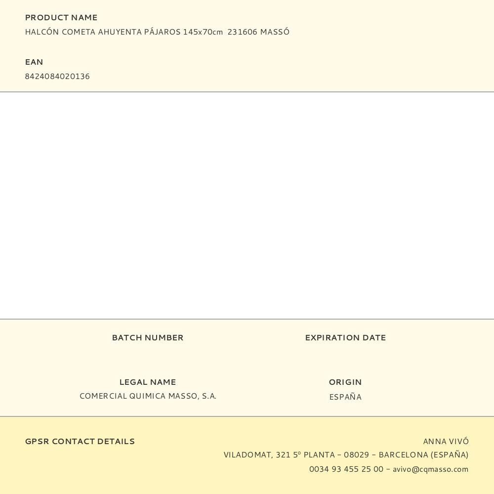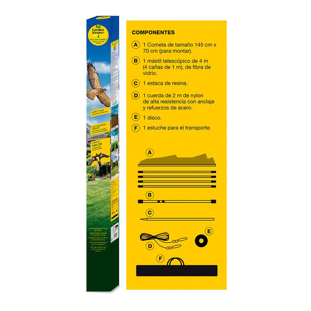 AHUYENTA A LOS PÁJAROS DE EDIFICIOS Y CULTIVOS SIN DAÑAR SU HÁBITAT NATURAL. ALCANZA UNA ALTURA DE 6 m. IDEAL PARA SER USADO EN PARCELAS, HUERTOS, CAMPOS RECIÉN SEMBRADOS Y OTRAS ÁREAS VULNERABLES. FÁCIL DE MONTAR, CON MÁSTIL TELESCÓPICO DE 4 m DE ALTURA. SUBE Y BAJA EN PICADO SIMULANDO EL VUELO DE UN HALCÓN, MOVIMIENTO CONTINUO. AHUYENTADOR SEGURO, NO DAÑA LAS AVES NI LA VIDA SILVESTRE. 145 x 70 cm