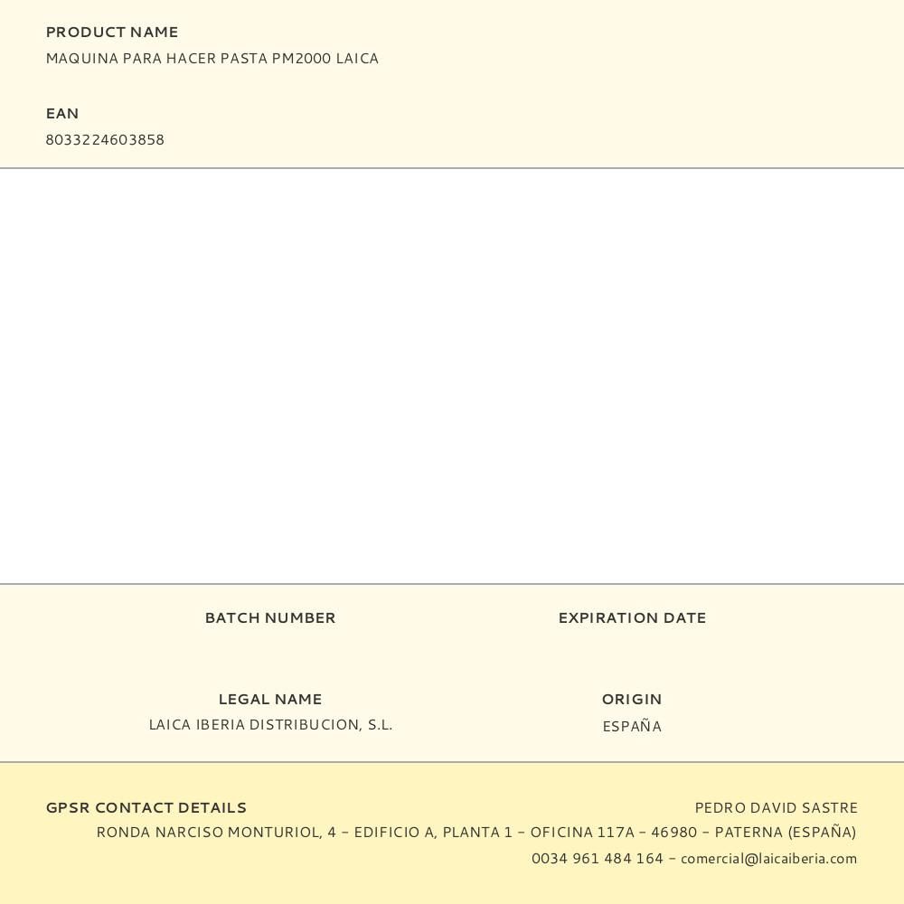 MAQUINA PARA HACER PASTA PM2000 LAICA. IDEAL PARA AMANTES DE LA PASTA CASERA FRESCA HECHA EN CASA. INCLUYE: 1 MAQUINA PARA HACER PASTA, 1 RODILLO DE CORTE DOBLE INTERCAMBIABLE, 1 MANIVELA, 1 ABRAZADERA CON TORNILLO, 2 MANUALES DE INSTRUCCIONES. CON EL RODILLO INCLUIDO SE PUEDEN HACER PLACAS PARA LASAÑA, FETTUCCINE 6 mm Y TAGLIATELLE 2 mm. APERTURA MINIMA 0.3 mm Y APERTURA MÁXIMA 3 mm. ANCHO MAXIMO 150 mm. POMO REGULADOR A 7 POSICIONES. CUERPO DE LA MAQUINA EN ACERO Y RODILLOS EN ALUMINIO. DIMENSIONES: 20,2 x 19,6 x 15,2 cm