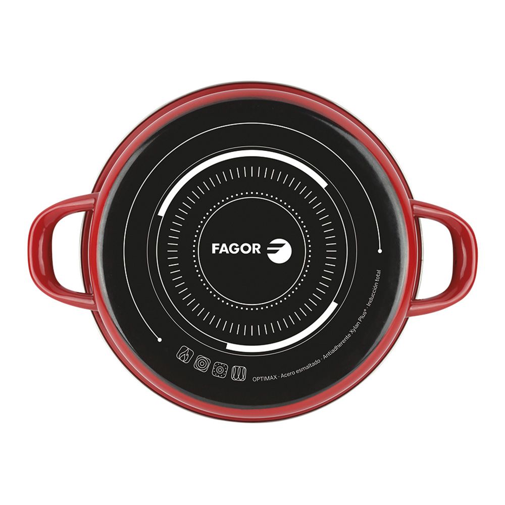 TARTERA OPTIMAX Ø24cm ROJA ACERO ESMALTADO AISI 430. ACERO ESMALTADO. ALTO ESPESOR DE ACERO CON 5 CAPAS DE RECUBRIMIENTO. ANTIADHERENTE DE DOBLE CAPA XYLAN PLUS. CERQUILLO DE ACERO INOXIDABLE. MANGOS ERGONOMICOS DE BAQUELITA TERMOAISLANTE. LIBRE DE CADMIO Y PFOA. 0,0% METALES PESADOS. APTO PARA TODO TIPO DE FUEGOS. APTO PARA HORNO. FAGOR