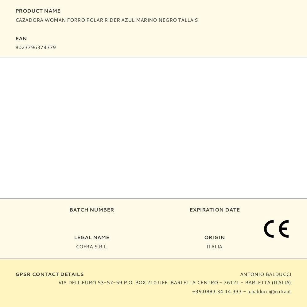 CAZADORA WOMAN FORRO POLAR RIDER AZUL MARINO NEGRO TALLA S AMPLIOS BOLSILLOS EN EL BAJO DE LA PRENDA CON CIERRE DE CREMALLERA, BOLSILLO EN EL PECHO, CINTURA AJUSTABLE CON CORDON, INSERTADOS REFLECTANETES, PARCHE ANTIABRASION EN LAS MANGAS, PASADOR PORTA TARJETA, PUÑOS ELASTICOS. COMPOSICION 100% POLIESTER. GRAMAJE 280g/m²