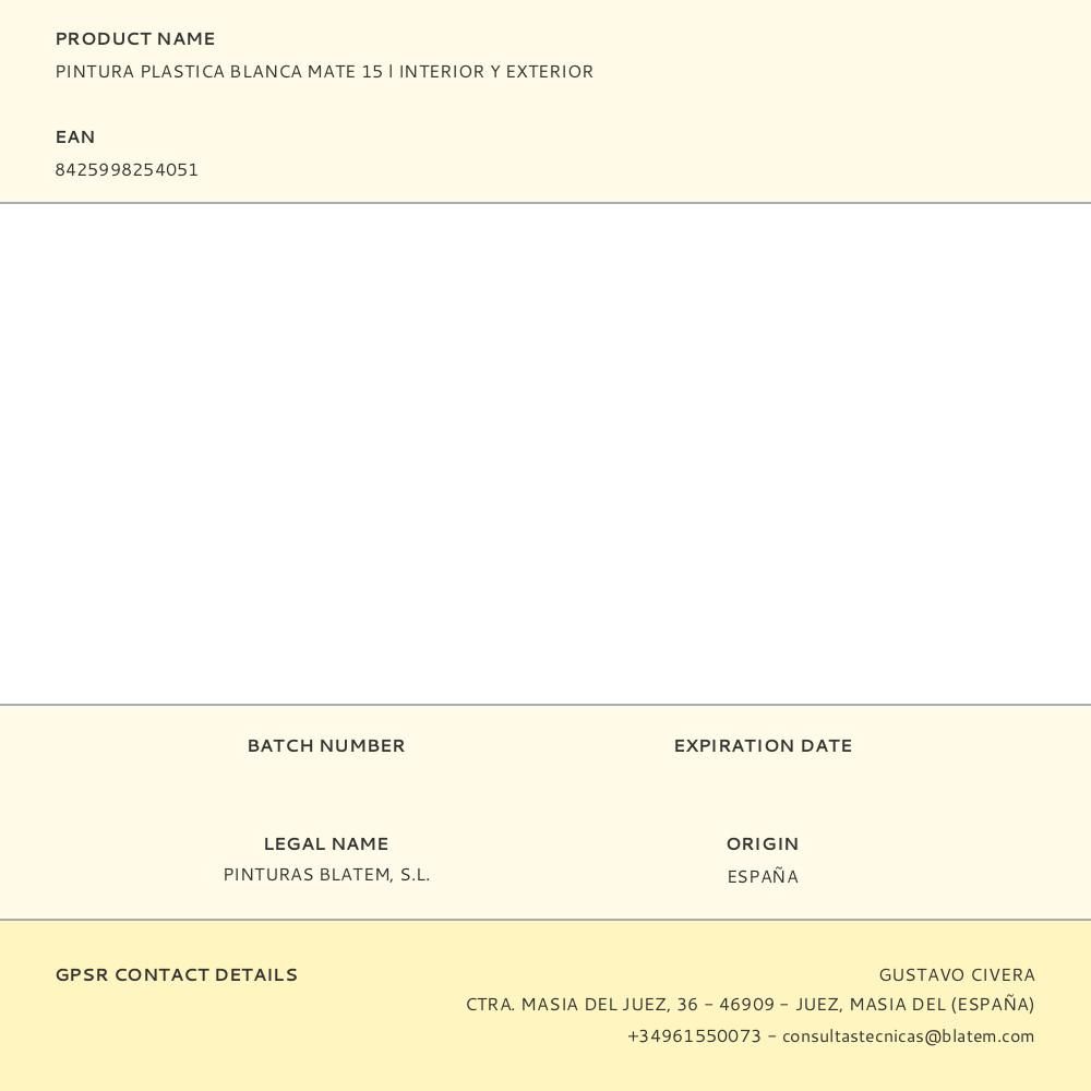 PINTURA PLÁSTICA ACRÍLICA ESTIRENADA INTERIOR/EXTERIOR BLANCO MATE 15 L
