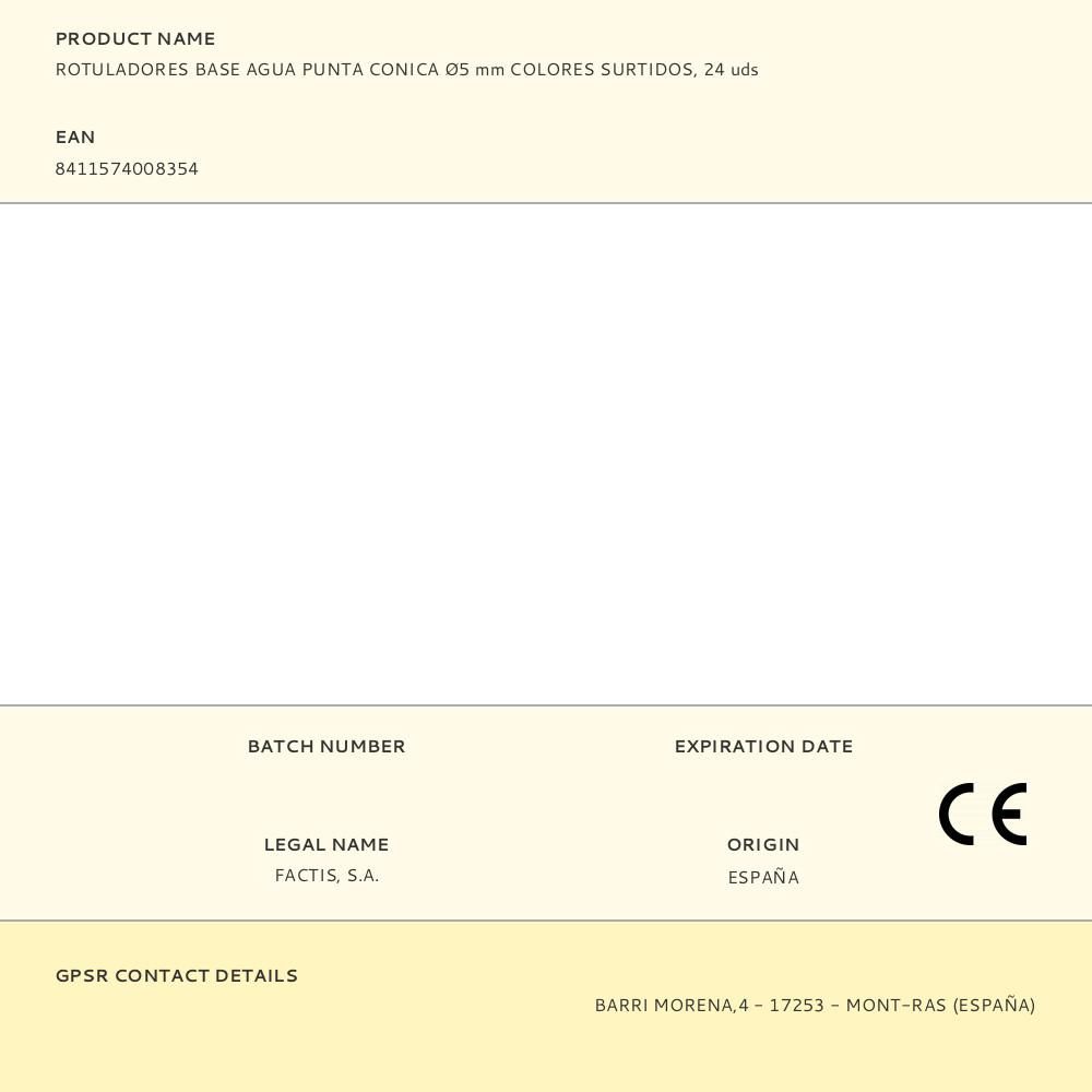 CAJA CON 24 ROTULADORES DE PUNTA CONICA BASE AGUA MILAN. ROTULADORES DE PUNTA CÓNICA 5 MM Ø QUE PERMITE REALIZAR TRAZOS DESDE 0,75 MM A 3 MM. PUNTA RESISTENTE A LOS GOLPES Y A LA PRESIÓN. TINTA A BASE DE AGUA QUE PROPORCIONA UNOS COLORES BRILLANTES DE FÁCIL APLICACIÓN Y MEZCLABLES ENTRE SÍ. POR SU TIPO DE PUNTA SE RECOMIENDAN PARA RELLENAR SUPERFICIES DE COLOR. PUEDE LAVARSE FÁCILMENTE SOBRE LA MAYORÍA DE TEJIDOS(PONER LA PRENDA EN REMOJO EN AGUA FRÍA DURANTE UNA HORA Y LAVAR A MÁQUINA, TAMBIÉN CON AGUA FRÍA). CON CAPUCHÓN DE SEGURIDAD VENTILADO. 24 COLORES