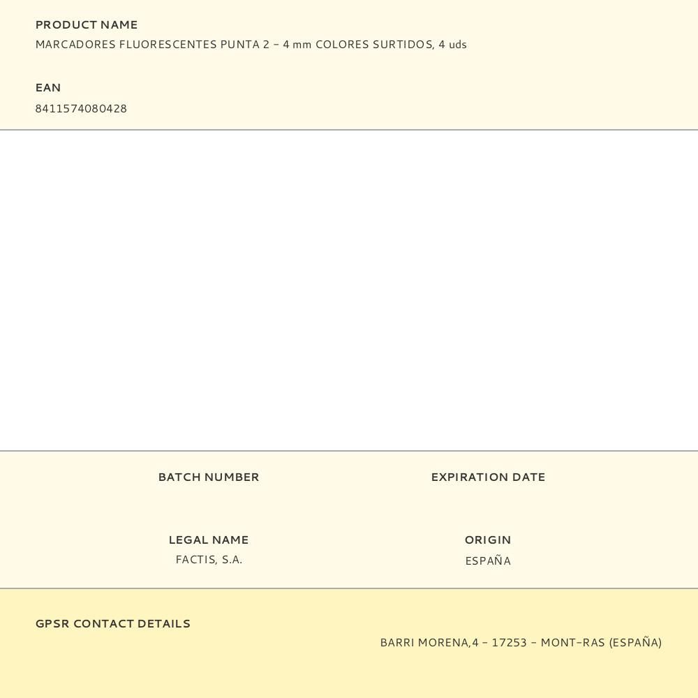 MARCADORES FLUORESCENTES PUNTA 2 - 4 mm COLORES SURTIDOS, 4 uds
