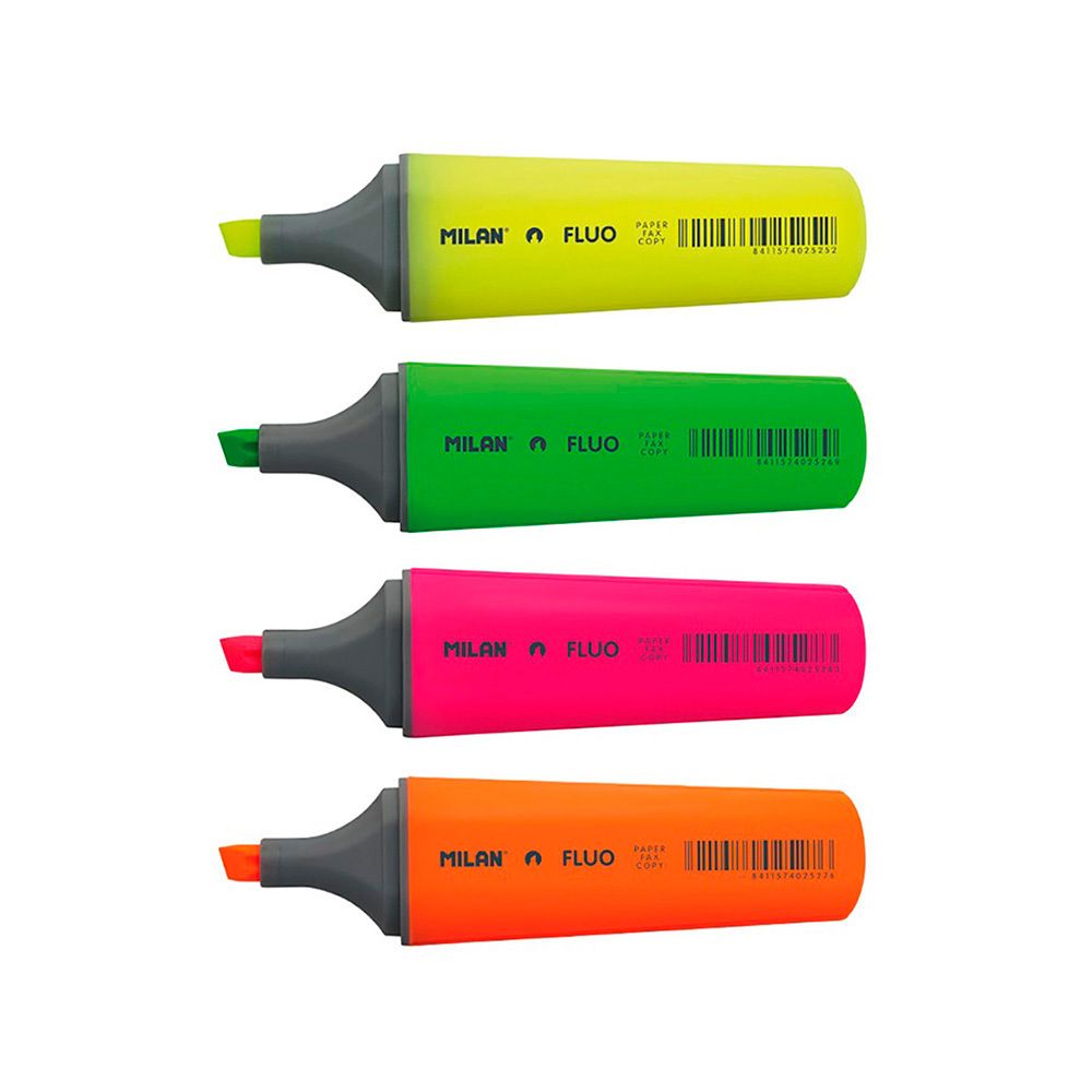 PACK CON 4 MARCADORES FLUORESCENTES PUNTA BISELADA MILAN. 4 ROTULADORES FLUORESCENTES COLOR AMARILLO, NARANJA, ROSA, VERDE. PUNTA BISELADA 1 - 4,8mm. PARA SUBRAYAR Y RESALTAR SOBRE PAPEL, FOTOCOPIAS O PAPEL TÉRMICO. COLORES / MODELOS SURTIDOS