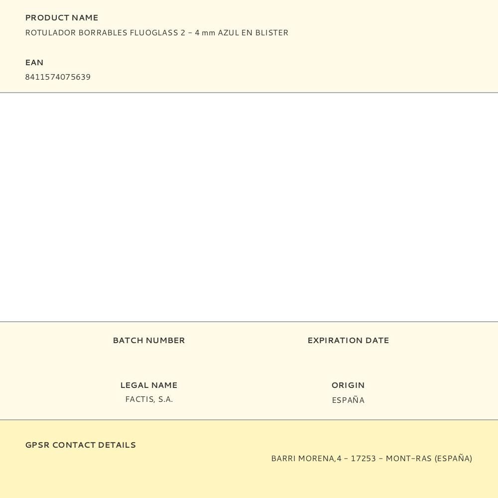BLISTER CON ROTULADOR AZUL FLUOGLASS 2 - 4mm MILAN. ROTULADORES PARA SUPERFICIES LISAS NO POROSAS (VENTANAS, ESPEJOS, PIZARRAS, ETC.). PUNTA BISELADA 2 - 4mm. TINTA A BASE DE AGUA, FÁCILMENTE BORRABLE CON LA AYUDA DE UN PAÑO HÚMEDO. GRACIAS A LA ALTA CONCENTRACIÓN DE PIGMENTOS LOS COLORES SE MANTIENEN INTENSOS Y BRILLANTES. COLOR AZUL.