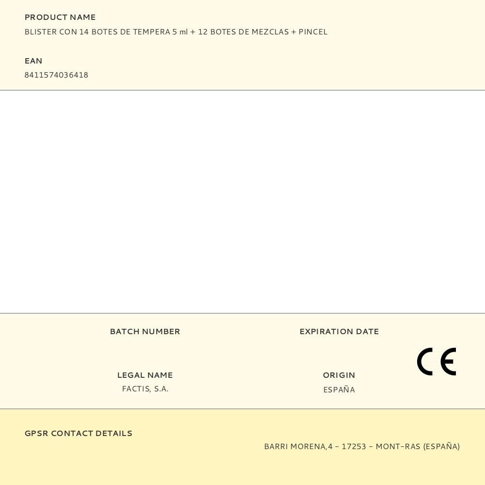BLISTER CON 14 BOTES DE TEMPERA 5 ml + 12 BOTES DE MEZCLAS + PINCEL