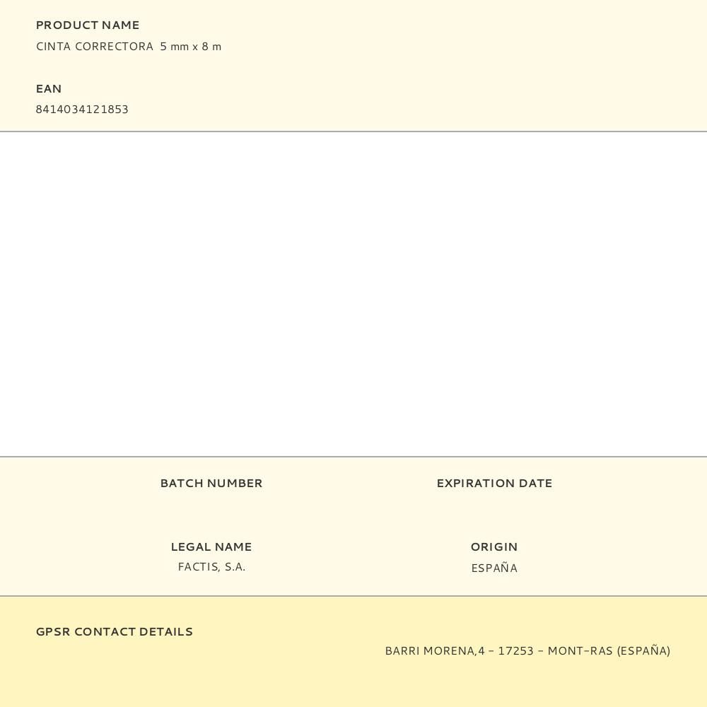 CINTA CORRECTORA 5mm x 8m MILAN 5mm x 8m MILAN PRECIO POR UNIDAD. CINTA CORRECTORA EN SECO. APTA PARA ZURDOS GRACIAS A LA ROTACIÓN DE 180° DE SU PUNTA. RÁPIDA, LIMPIA Y PRECISA. CORRECCIONES SOBRE TODO TIPO DE PAPEL, NO DEJA MARCAS EN FOTOCOPIAS O FAX. 5mm DE ANCHO x 8m DE LARGO.