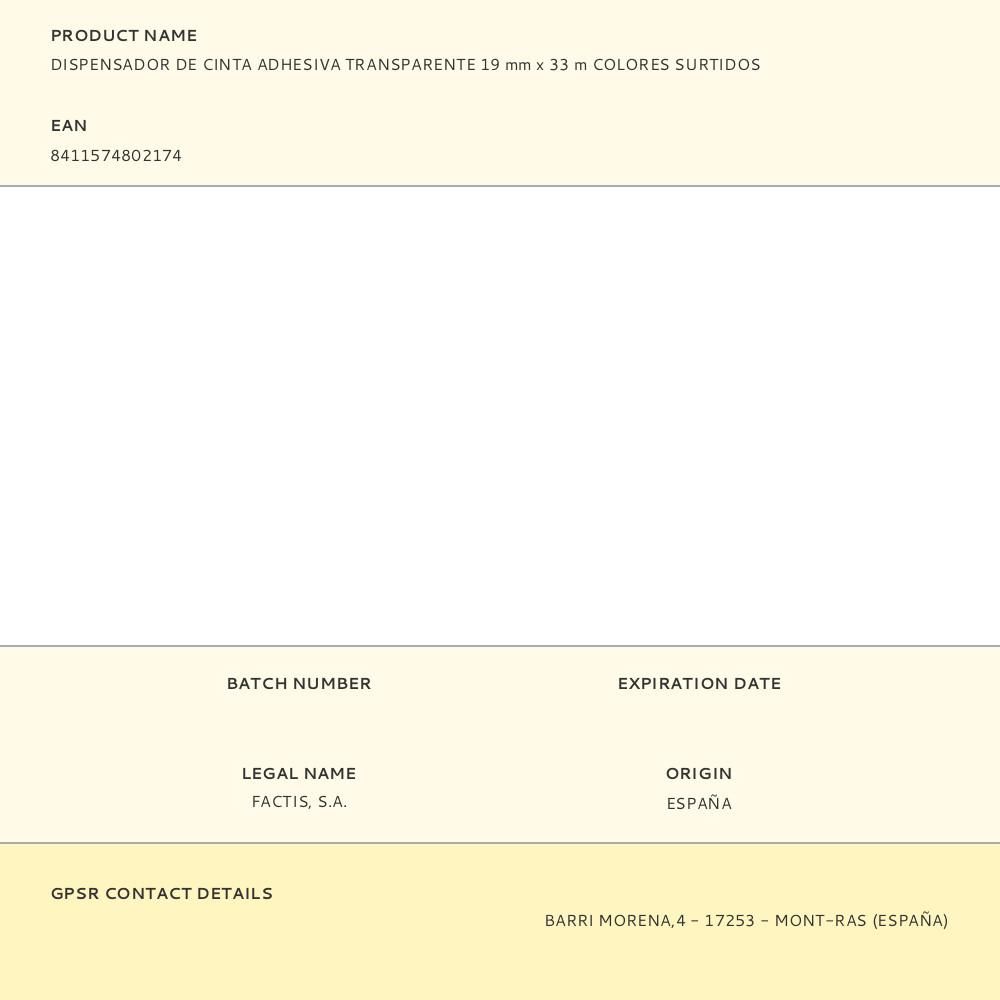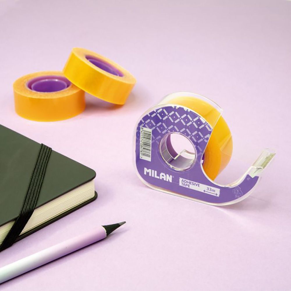 DISPENSADOR DE CINTA ADHESIVA TRANSPARENTE 19mm x 33m MILAN. PRECIO POR UNIDAD. CINTA ADHESIVA CON DISPENSADOR. COLORES SURTIDOS: AMARILLO,AZUL, ROJO Y VERDE. MATERIAL: PVC