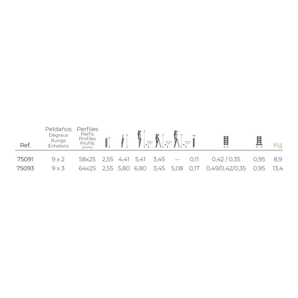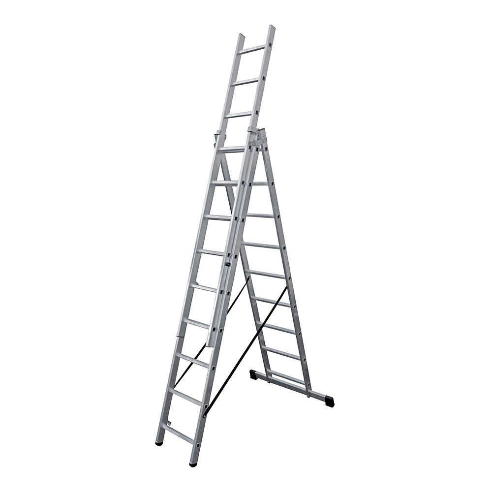 ESCALERA TRANSFORMABLE DE ALUMINIO 3 x 9 PELDAÑOS. MEDIDAS PLEGADAS: 49 x 19 x 255 cm. ALTURA DEL ÚLTIMO PASO 5,80 m. PESO DE LA ESCALERA: 13,4 kg. PESO MÁXIMO: 150 kg. 6,04 m DE LONGITUD MÁXIMA EN USO, SISTEMA DE BLOQUEO DE SEGURIDAD, GUIAS DE DESLIZAMIENTO EN ALUMINIO, BASE ESTABILIZADORA Y CINTA DE SEGURIDAD DE NYLON. EN131