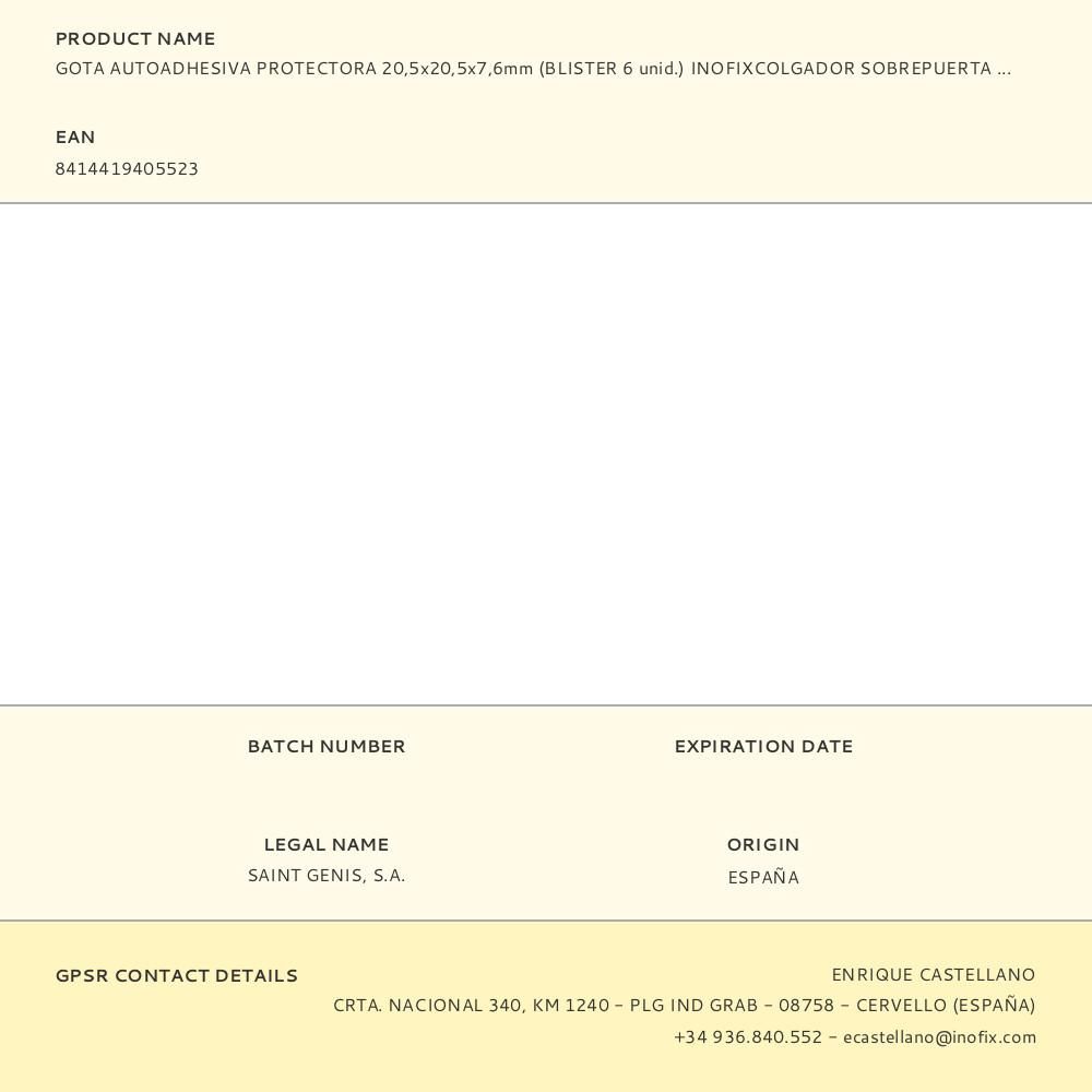 GOTA AUTOADHESIVA PROTECTORA 20,5x20,5x7,6mm (BLISTER 6 unid.) INOFIXCOLGADOR SOBREPUERTA BLANCO BLISTER INOFIX
