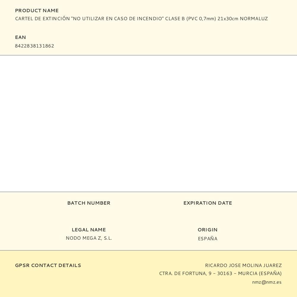 CARTEL DE EXTINCIÓN "NO UTILIZAR EN CASO DE INCENDIO" CLASE B (PVC 0,7mm) 21x30cm NORMALUZ