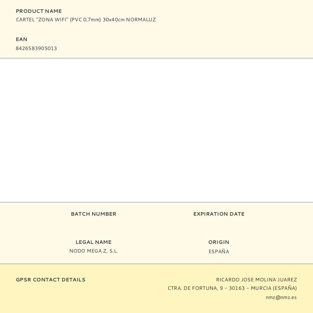 CARTEL "ZONA WIFI" (PVC 0,7mm) 30x40cm NORMALUZ
