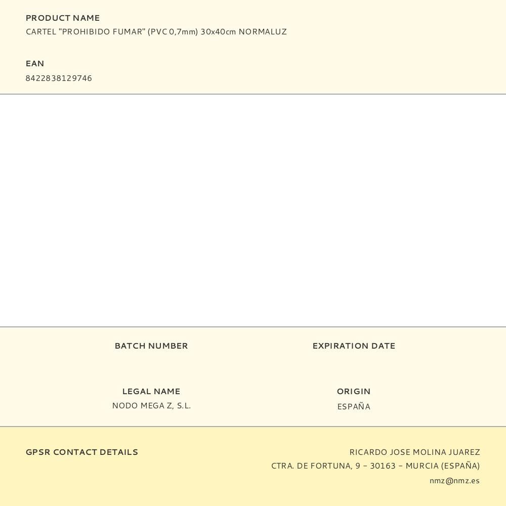 CARTEL "PROHIBIDO FUMAR" (PVC 0,7mm) 30x40cm NORMALUZ