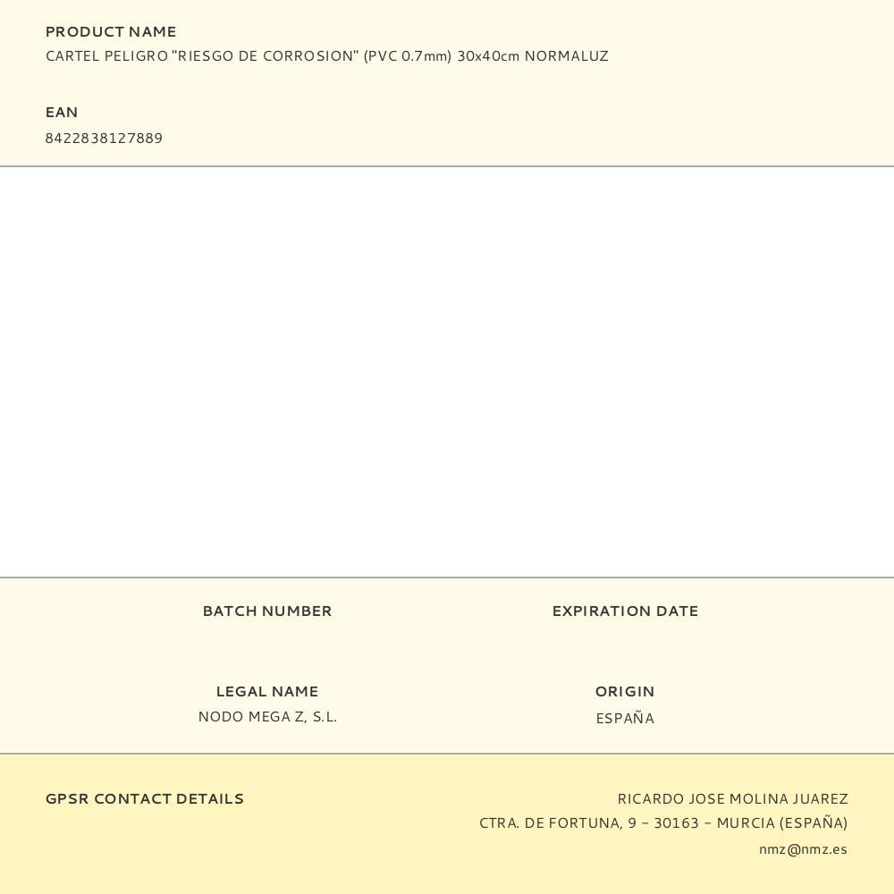 CARTEL PELIGRO "RIESGO DE CORROSION" (PVC 0.7mm) 30x40cm NORMALUZ