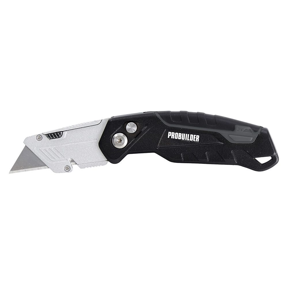 CÚTER PLEGABLE. ALMACENAMIENTO PARA 3 CUCHILLAS. CON SUSPENSION PARA EL CINTURÓN DE HERRAMIENTAS / BOLSILLO. 3 POSICIONES DE ANGULO: 0°, 45° Y 90°,AVE AGARRE SUAVE - MATERIAL CUERPO DE ALUMINIO - COLOR NEGRO