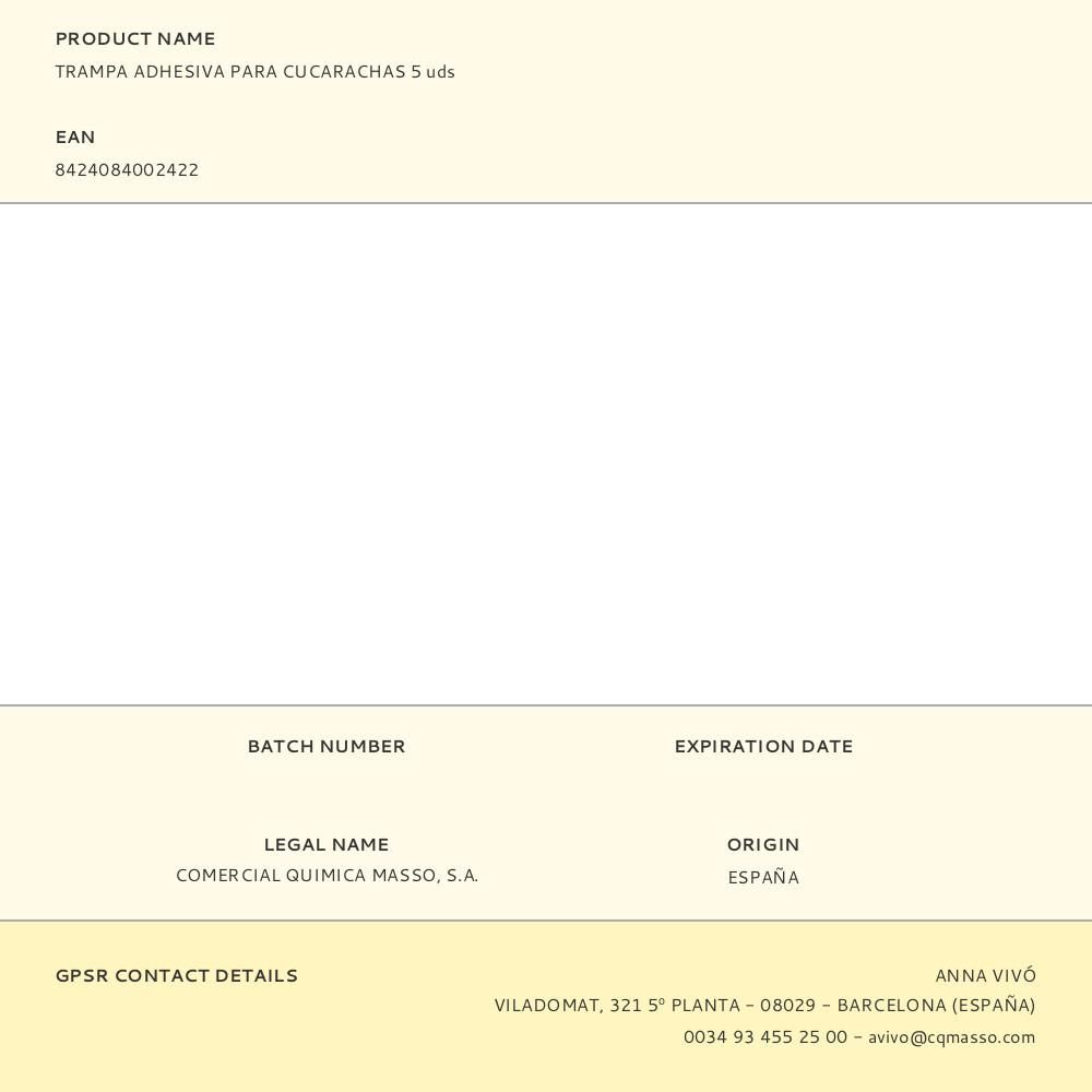 TRAMPA ADHESIVA PARA CUCARACHAS, 5 uds. ATRAYENTES NATURALES ALIMENTICIOS. NO CONTIENE ACTIVOS QUÍMICOS. USO DOMÉSTICO
