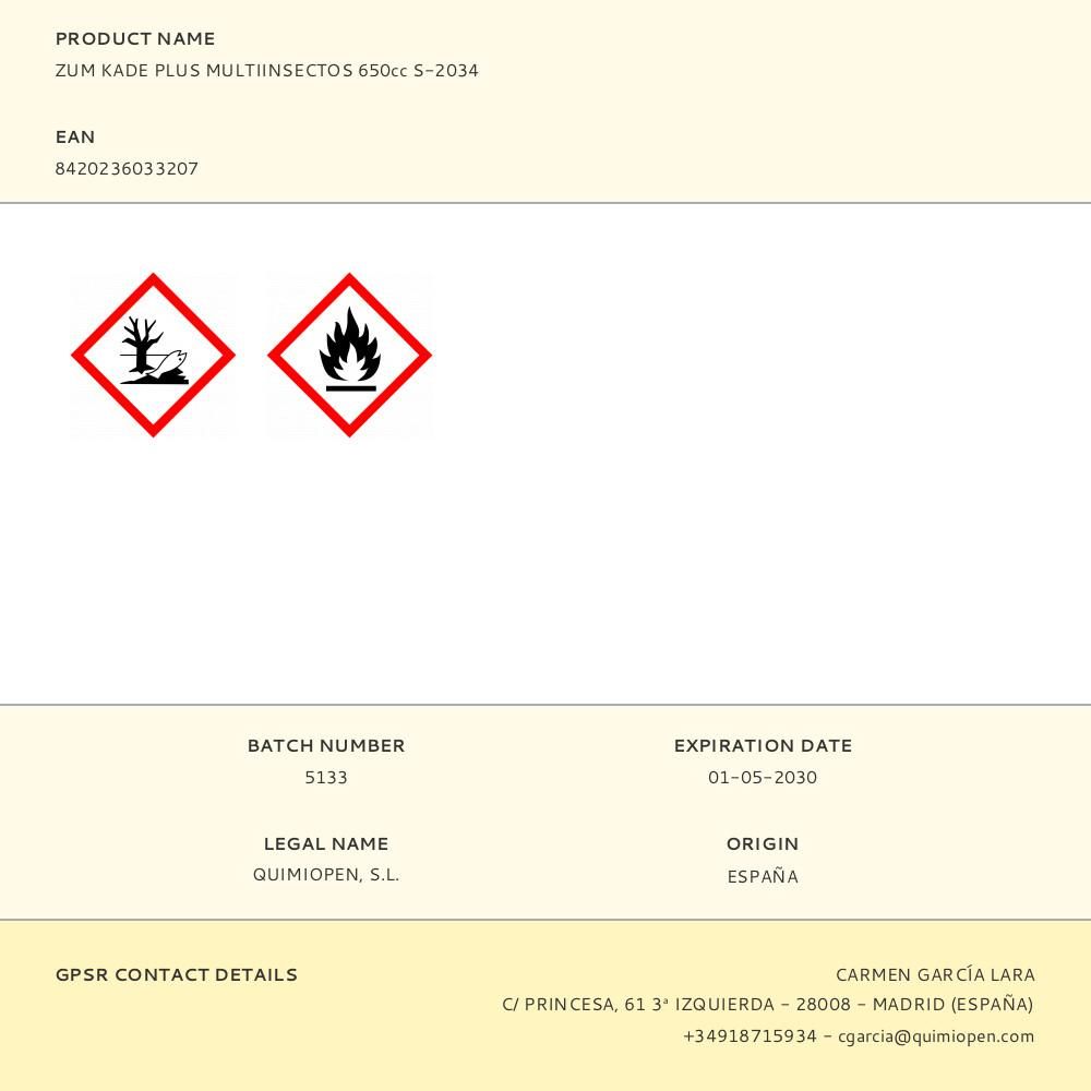 INSECTICIDA KADE PLUS MULTI-INSECTOS VOLADORES 650 ml. INSECTICIDA PIRETROIDE CONTRA AVISPAS, MOSCAS, MOSQUITOS Y OTROS INSECTOS VOLADORES