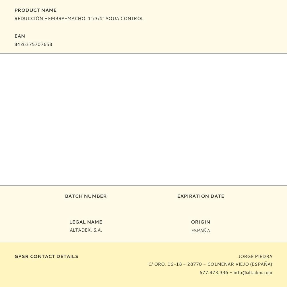 REDUCCIÓN HEMBRA - MACHO 1 x ¾ pulg. MATERIAL: POLIPROPILENO. TRATAMIENTO ANTI UV