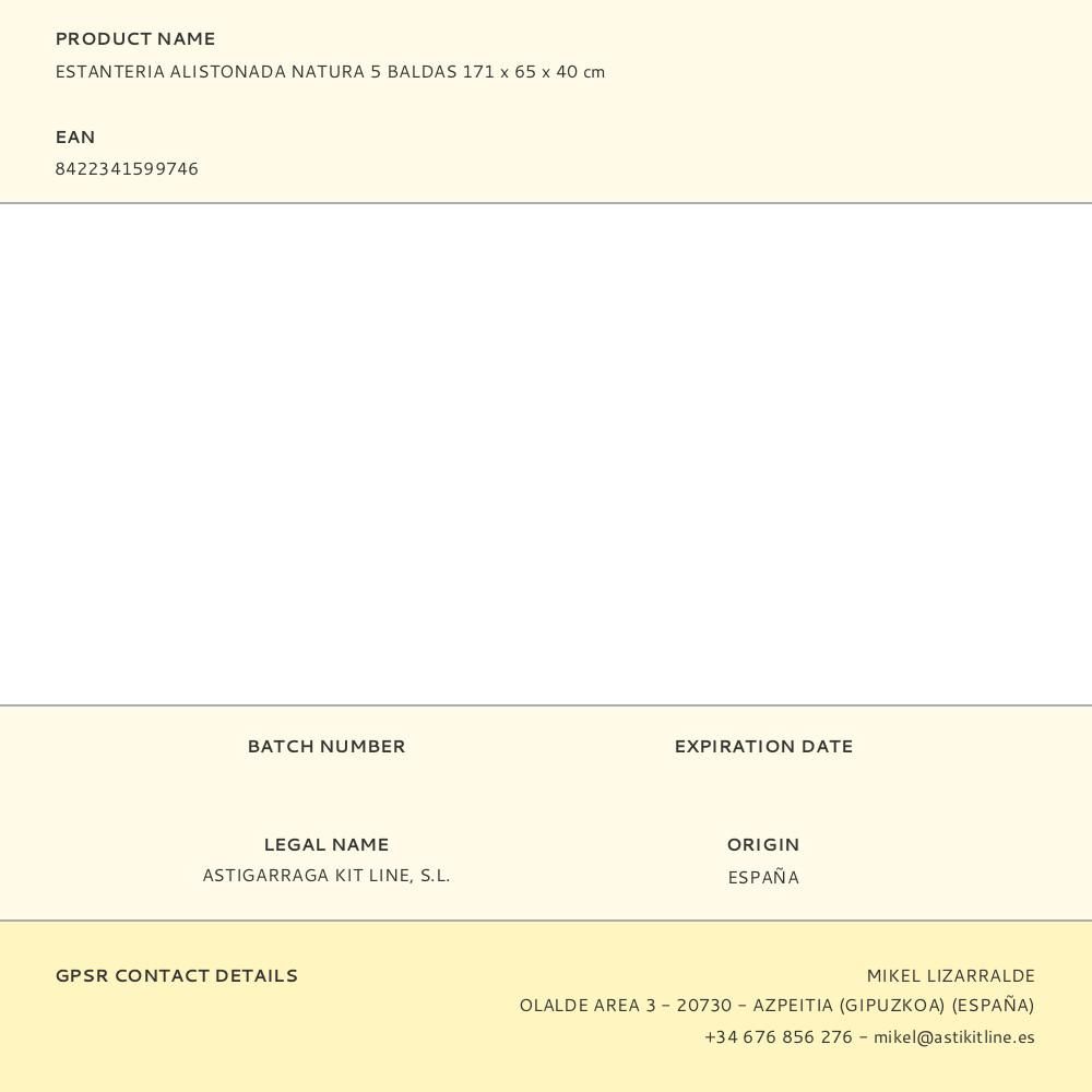 ESTANTERIA ALISTONADA NATURA 5 BALDAS FONDO ASTIGARRAGA. MEDIDAS: 171x65x40cm Y 16mm DE GROSOR.