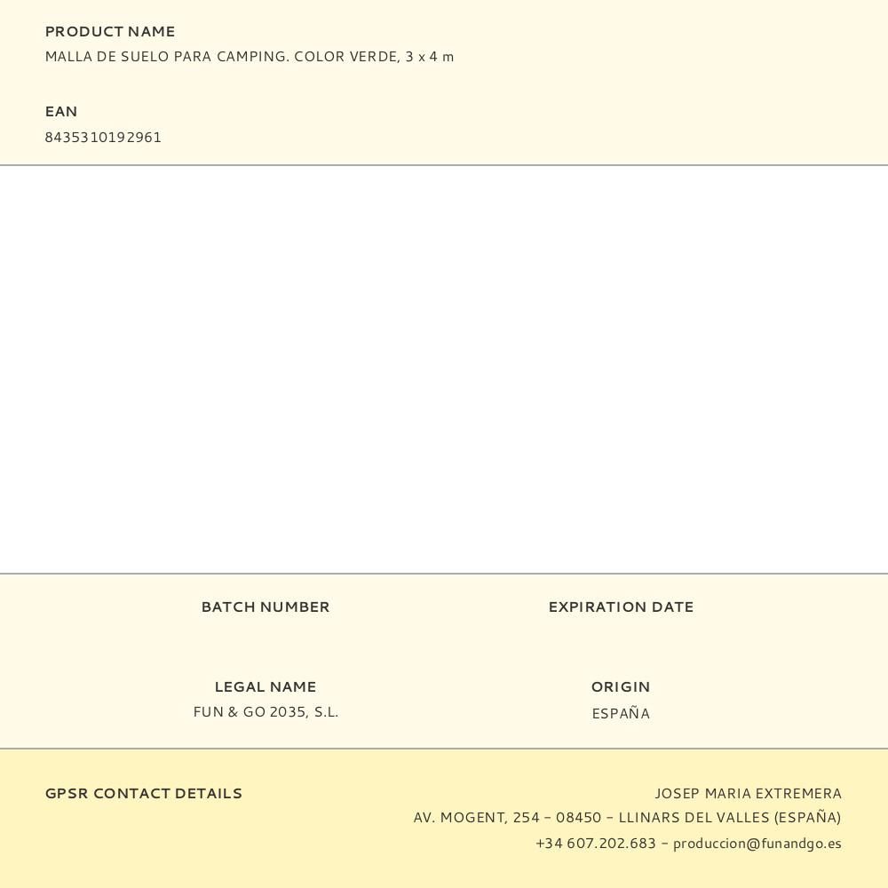 MALLA DE SUELO PARA CAMPING. COLOR VERDE MEDIDA: 3x4m (ancho/fondo) APTO PARA EXTEIOR. FUN&GO