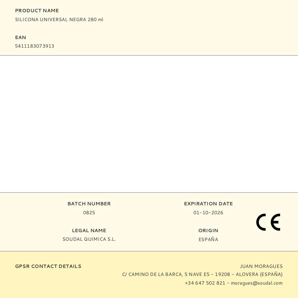 SOUDAL SELLADOR DE SILICONA NEGRA 280 ml, ACETICA PARA USO GENERAL. MUY ELASTICA. IDEAL PARA APLICACIONES GENERALES DE CONSTRUCCIÓN, PUESTO QUE SE PUEDE UTILIZAR TANTO PARA JUNTAS INTERIORES COMO EXTERIORES. SIN EMBARGO, POR SU CONTENIDO DE ACIDO ACETICO NO DEBE UTILIZARSE SOBRE SOPORTES SINTETICOS. NO SE PUEDE PINTAR. IDEAL PARA JUNTAS SOBRE DIVERSOS SOPORTES, TANTO POROSOS COMO NO POROSOS COMO LADRILLOS, MADERA, PLACAS DE YESO, BALDOSAS, PORCELANA, VIDRIO...