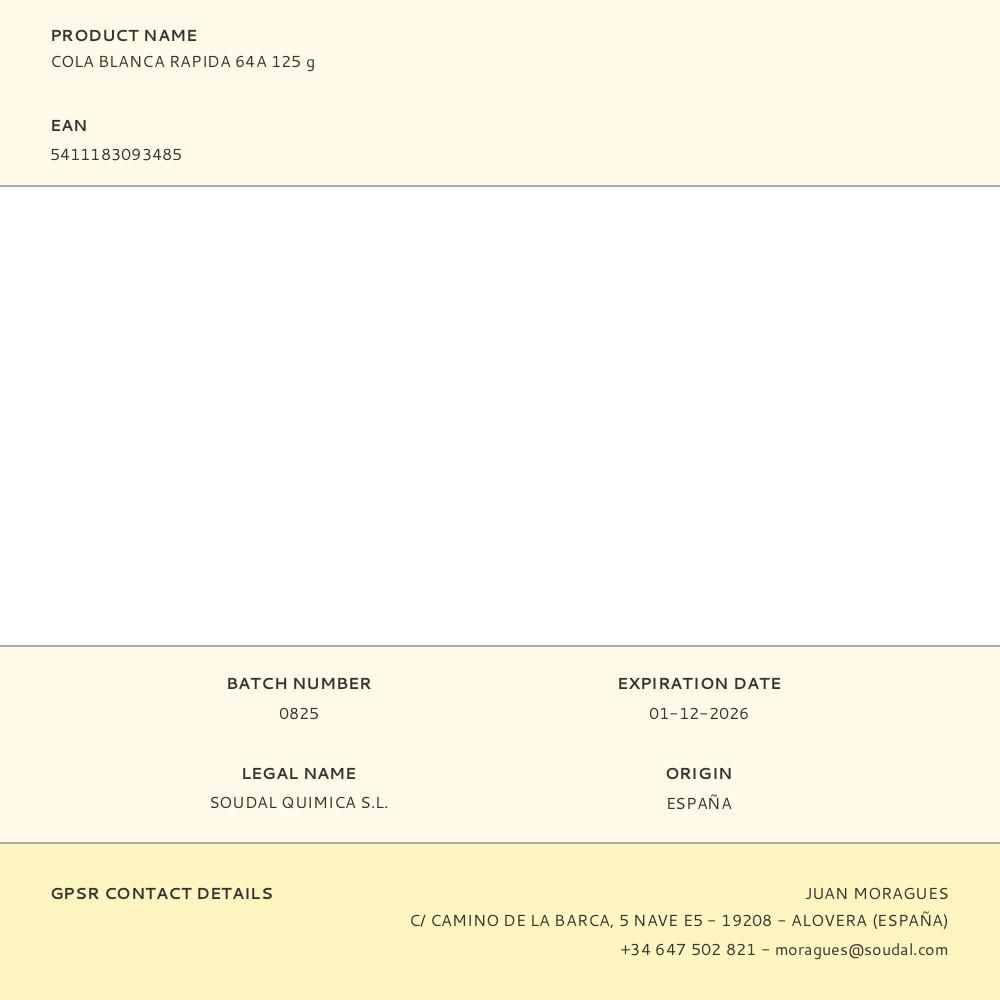 COLA BLANCA RAPIDA 64A 125 g. PEGADO DE TODO TIPO DE ENSAMBLAJES DE MADERA POROSAS (MADERA, PAPEL, MDF...) SECADO RAPIDO (20 MINUTOS) Y ALTA POTENCIA ADHESIVA)
