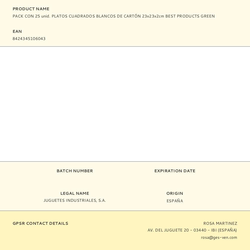 PLATOS DE CARTÓN CUADRADOS BLANCOS 23 x 23 x 2 cm, 25 uds