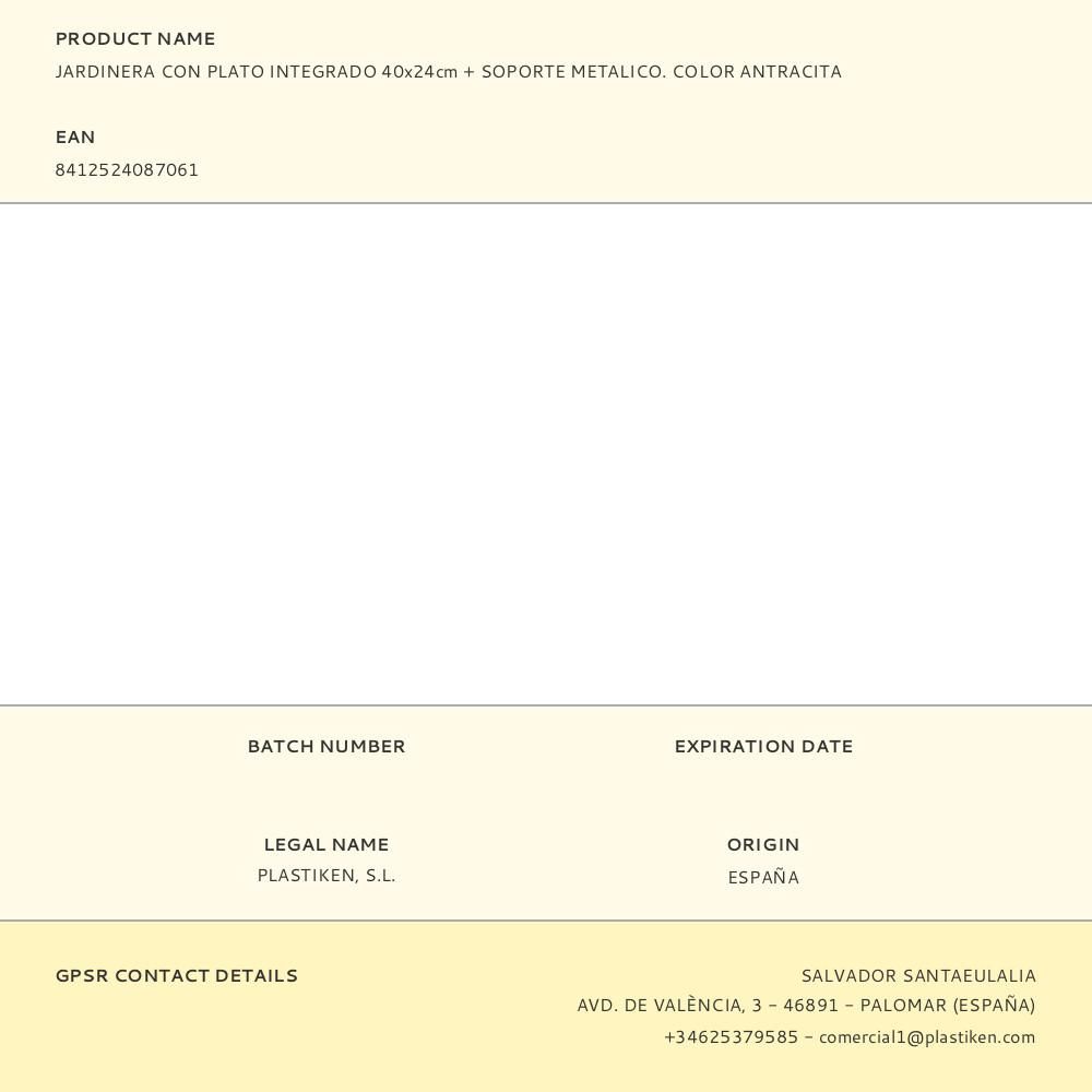 JARDINERA CON PLATO INTEGRADO 40x24cm (ancho/fondo) + SOPORTE METALICO. COLOR ANTRACITA. PENSADA PARA USO EN EXTERIORES POR SU ALTA RESISTENCIA A LOS RAYOS SOLARES, SU ROBUSTEZ Y SU TEXTURA
