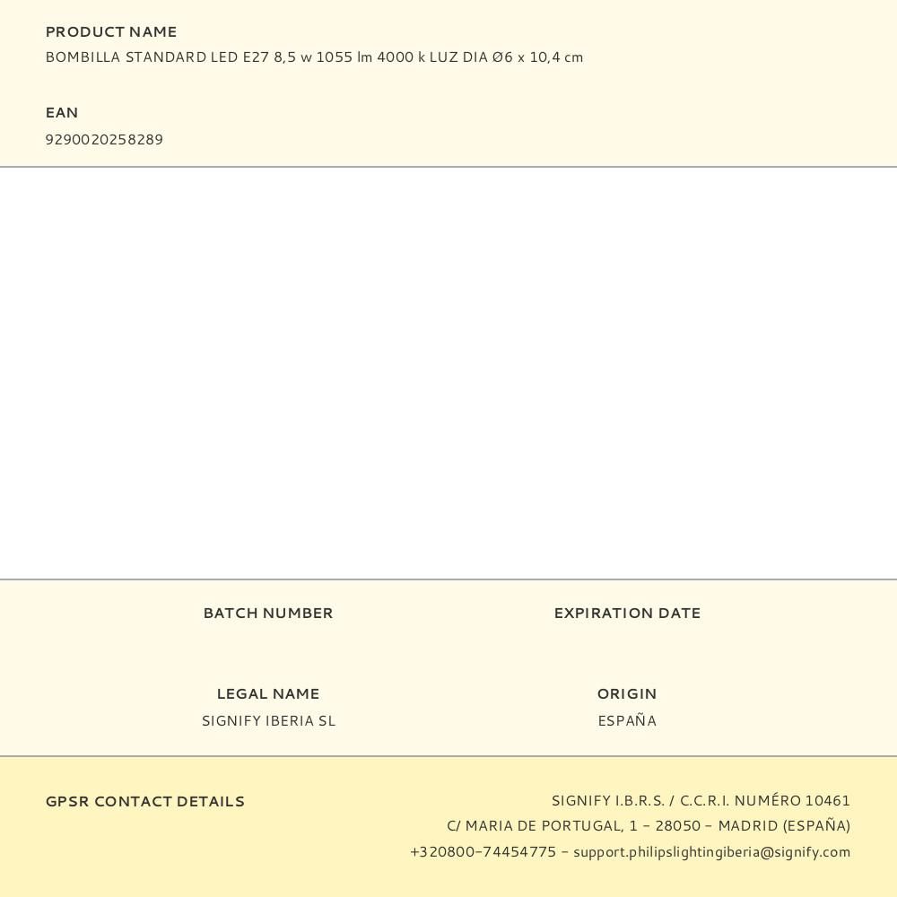 BOMBILLA STANDARD LED E27 8,5W 1.055lm 4000K LUZ DIA. MEDIDA: Ø6x10,4cm (diámetro/alto) 15000h. AC 220-240V CRISTAL MATE, NO REGULABLE, IRC:80 ANGULO DE APERTURA 360°. EQUIVALENCIA: 75W. PHILIPS