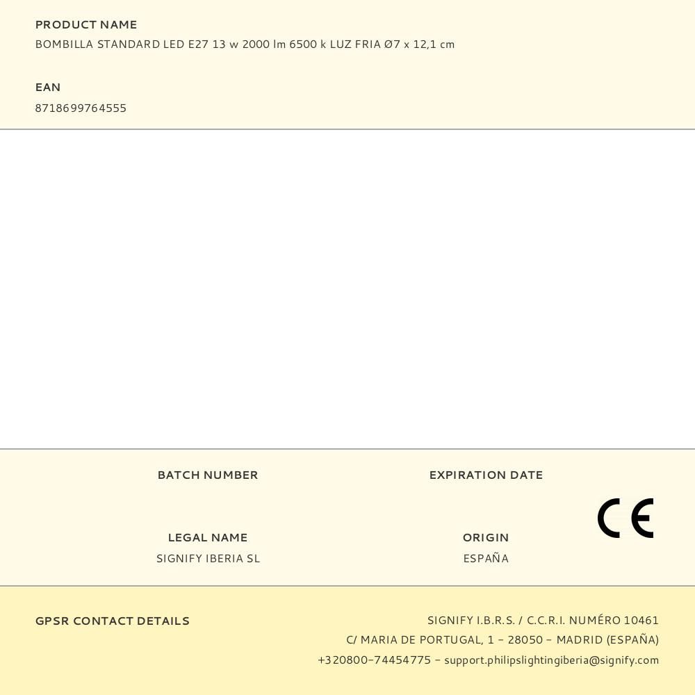 BOMBILLA STANDARD LED E27 13W 2000lm 6500K LUZ FRIA. MEDIDA: Ø7x12,1cm (diámetro/alto) 15000h. AC 220-240V CRISTAL MATE, NO REGULABLE, IRC:80 ANGULO DE APERTURA 360°. EQUIVALENCIA: 120W. PHILIPS