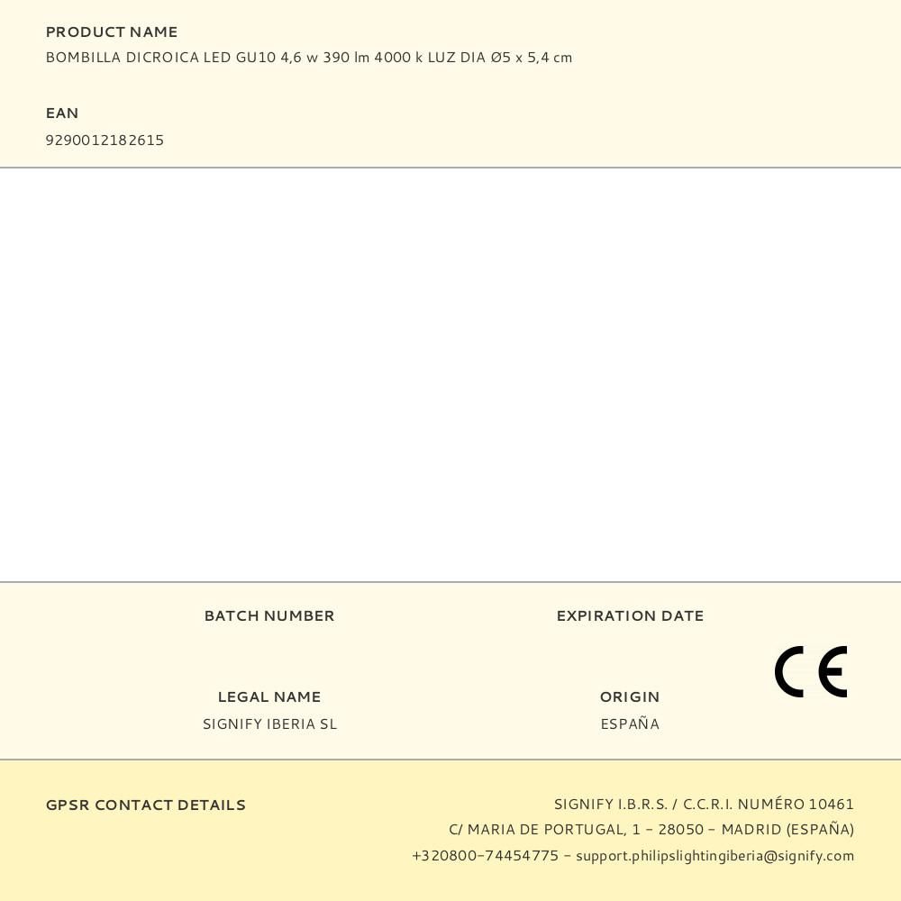 BOMBILLA GU10 LED 4,6W 390lm 4000K LUZ DIA. MEDIDA: Ø5x5,4cm (diámetro/alto) 15000h. AC 220-240V. . CRISTAL MATE. NO REGULABLE. ANGULO APERTURA 36°. EQUIVALENCIA: 50W. PHILIPS