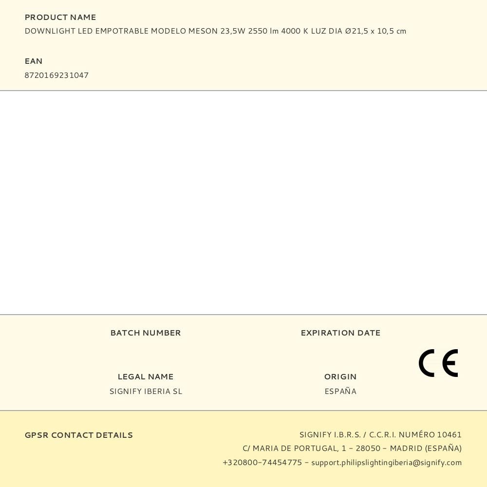 DOWNLIGHT DE EMPOTRAR DE LED 23,5W 2550lm 4000K LUZ DIA MOD. MESON. FABRICADO EN PLASTICO, COLOR BLANCO, 15000h. ANGULO APERTURA 110° , IRC80, NO REGULABLE MEDIDAS: Ø21,5x10,5cm (diámetro/alto) ENCLAVAMIENTO Ø20cm. GRADO DE PROTECCION: IP20. + TENSION: 220-240V. PHILIPS