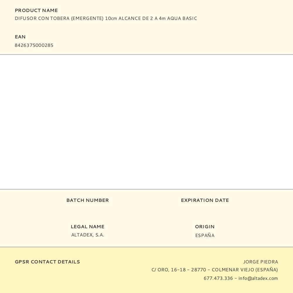DIFUSOR CON TOBERA, EMERGE 10 cm, ALCANCE 360° DE 2 A 4 m. CONEXIÓN: ½ pulg. PRESIÓN DE 2 bar. MATERIAL: POLIETILENO. TRATAMIENTO ANTI UV