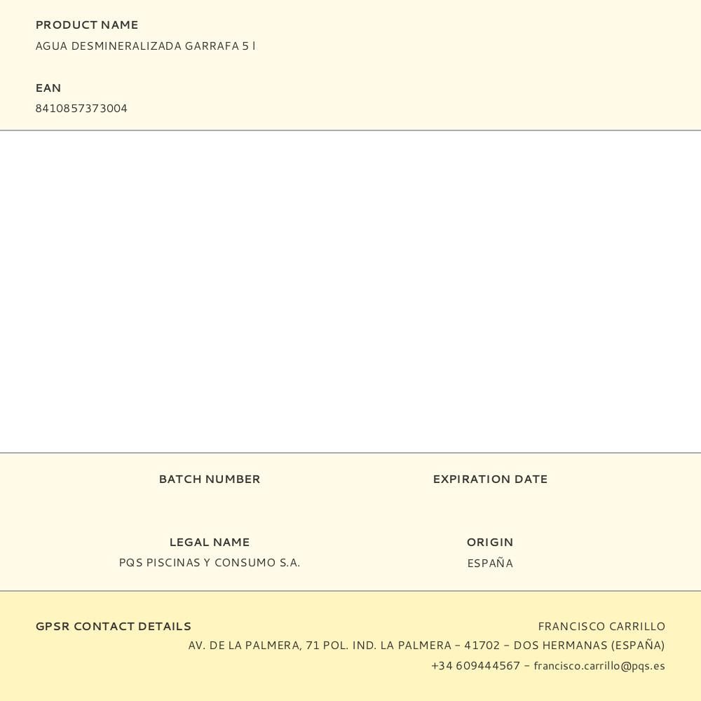 AGUA DESMINERALIZADA GARRAFA 5 l. APLICACIONES: PLANCHAS DE VAPOR. ACUMULADORES (BATERÍAS). PREPARACIÓN DE SOLUCIONES. LIMPIAPARABRISAS DE COCHES. RADIADORES DE COCHES.